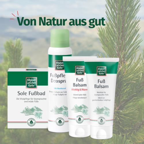Die Wirkstoffkombination entfaltet eine wohltuende Wärme, die die Füße umhüllt und ein angenehmes Fußgefühl mit sich bringt. Gleichzeitig pflegen die Inhaltsstoffe beanspruchte Füße streichelzart. Zur zusätzlichen Entspannung müder und strapazierter Füße eignet sich das Sole-Fußbad von Allgäuer Latschenkiefer. Für die Pflege der sehr trockenen, rissigen Füße kann die Fuß Butter mit dem Duft von Allgäuer Latschenkiefer und Orange verwendet werden.