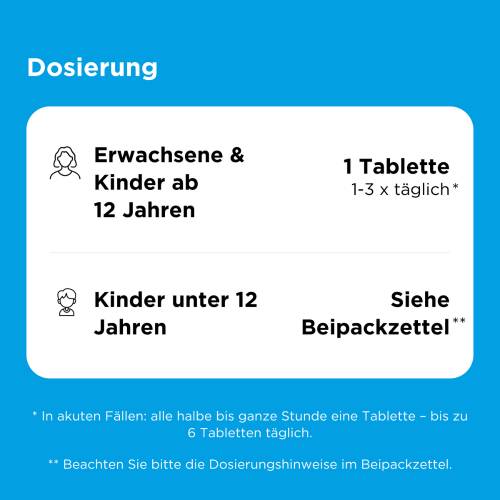 | Jugendliche ab 12 Jahren und Erwachsene | 1 Tablette | bis zu 12-mal täglich (maximal) | unabhängig von der Mahlzeit (im Abstand von jeweils 1/2-1 Stunde) |