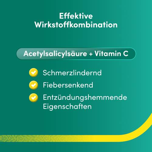 Das Arzneimittel besteht aus einer Wirkstoffkombination. Der Wirkstoff Acetylsalicylsäure wirkt schmerzstillend, fiebersenkend und entzündungshemmend zugleich. Er blockiert die Bildung bestimmter Botenstoffe im Körper, so genannte Prostaglandine. Diese sind an der Entstehung von Schmerzen, Fieber und Entzündungen wesentlich beteiligt.