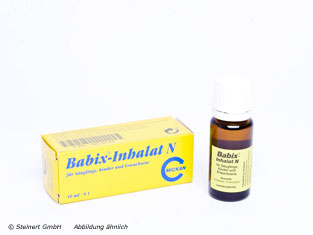 Babix Inhalat wird angewandt bei Erkrankungen der oberen und unteren Atemwege,Bronchitis und Pseudokrupp. Babix enthält die ätherischen Öle Fichtennadelöl und Eukalyptusöl. Die Öle lindern nachhaltig Atembeschwerden indem sie die Nase frei machen, sie wirken schleimlösend und erleichtern das Abhusten. Außerdem hat Babix eine leicht entzündungshemmende Wirkung. Die Lösung wird auf ein Kleidungsstück des Säuglings oder Kleinkindes in Nähe der Atmungsorgane gegeben. Sie darf nicht im Gesicht, in Nase oder innerlich angewendet werden.