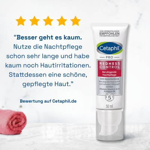 Die beruhigende Nachtpflege von Cetaphil PRO RednessControl regeneriert empfindliche Rosazea-Haut und versorgt sie dank Hyaluronsäure, Glycerin und Provitamin B5 intensiv mit wohltuender Feuchtigkeit. Rötungen werden reduziert und die Haut spürbar geschmeidig. Die beruhigende Nachtpflege ist Teil der dermatologischen Pflegeserie Cetaphil PRO RednessControl. Diese wurde gezielt zur begleitenden Pflege bei Gesichtsrötungen durch Rosazea sowie Begleiterscheinungen wie Juckreiz, Stechen und Brennen der Haut entwickelt. Die Nachtcreme ist nicht komedogen und frei von Duftstoffen.