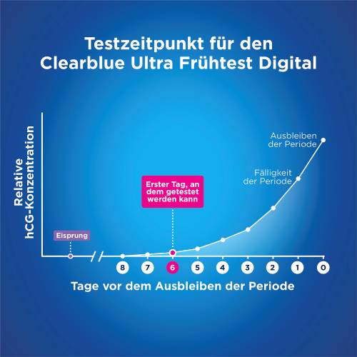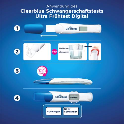 Das Clearblue Schwangerschaftstest Ultra Frühtest Digital Kit kombiniert eine ultrasensitive Früherkennung des Schwangerschaftshormons mit eindeutigen digitalen Ergebnissen in Worten. Unser empfindlichster digitaler Schwangerschaftstest kann bis zu sechs Tage vor dem Ausbleiben der Periode angewendet werden.1 Die Empfindlichkeit des Tests liegt bei 10 mIU/ml. Das Testen wird durch eine besonders breite Testspitze und durch das einzigartiges Stopp-Licht vereinfacht, dies blinkt, wenn ausreichend Urin von der Testspitze aufgenommen wurde. Darüber hinaus trägt unsere Floodguard-Technologie zu einer deutlichen Verringerung von Benutzerfehlern bei.2 Sobald der Test läuft, wird der Smart Countdown auf dem Display angezeigt, um zu bestätigen, dass der Test auswertet, und um die Zeit bis zu Ihrem eindeutigen digitalen Ergebnis in Worten anzuzeigen, das innerhalb von 1–5 Minuten erscheint. Wie alle Clearblue Schwangerschaftstests ist auch der Ultra Frühtest Digital zu über 99 % zuverlässig bei der Erkennung einer Schwangerschaft, wenn der Test ab dem Fälligkeitstag Ihrer Periode verwendet wird.