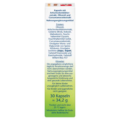 Die Kapseln von Doppelherz enthalten natürliche Extrakte aus Artischocke und Curcuma sowie wertvolles Olivenöl.