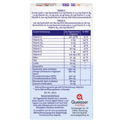 Kapsel 1 enthält die Vitamine A, C, E, B12 und B6, die Omega-3-Fettsäure DHA sowie die Spurenelemente Selen und Zink. Zusätzlich enthalten sind die Pflanzenstoffe Lutein und Zeaxanthin.