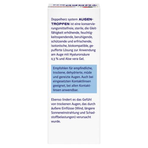In dem Medizinprodukt sind keine Konservierungsstoffe und Phosphate enthalten. Zusätzlich sind die Doppelherz system AUGEN-TROPFEN mit der augenberuhigenden Aloe vera kombiniert.
