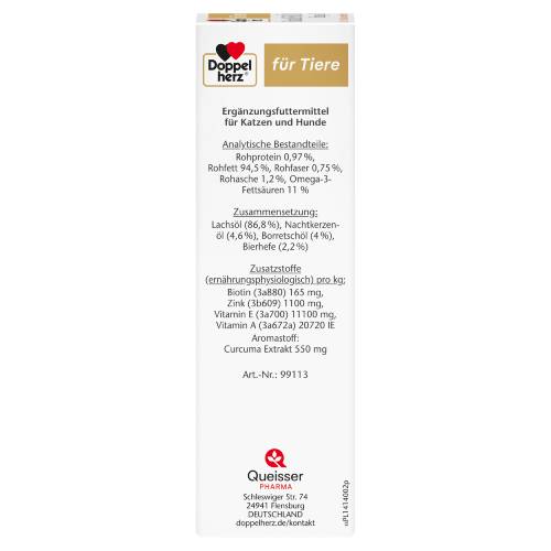 Doppelherz für Tiere Haut & Fell Öl ist ein Ergänzungsfuttermittel für Katzen und Hunde. Die hochwertige Ölmischung enthält wertvolle Feststoffe, ohne Zusatz von Zucker, Farb- und Konservierungsstoffen.