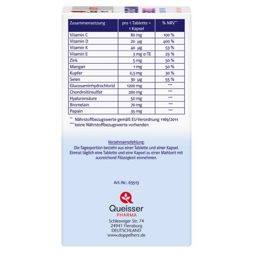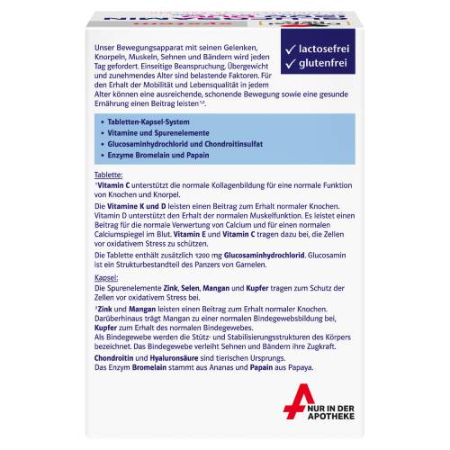 Zusätzlich sind 1200 mg Glucosaminhydrochlorid, 200 mg Chondroitinsulfat, 50 mg Hyaluronsäure sowie die Enzyme Bromelain und Papain enthalten.