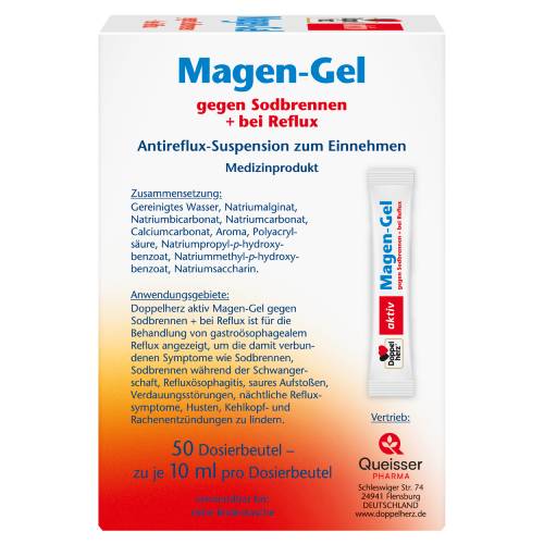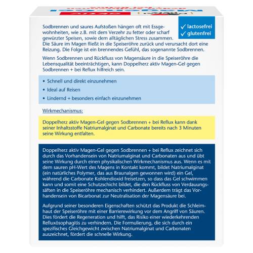 Doppelherz Magen-Gel gegen Sodbrennen + bei Reflux ist ein Medizinprodukt, welches zur Behandlung von gastroösophagealem Reflux zur Linderung der damit verbundenen Symptome wie Sodbrennen, Sodbrennen in der Schwangerschaft, Refluxösophagitis, saures Aufstoßen, Verdauungsbeschwerden, nächtliche Refluxsymptome, Husten und Kehlkopf-Rachen-Entzündung vorgesehen ist. Doppelherz Magen-Gel gegen Sodbrennen + bei Reflux kann dank der Wirkung seiner Inhaltsstoffe Natriumalginat und Carbonate innerhalb von 3 Minuten zu wirken beginnen. Das Produkt basiert auf Natriumalginat und Carbonaten. Seine Wirksamkeit lässt sich durch einen physikalischen Wirkmechanismus erklären. Sobald es mit den sauren pH-Verhältnissen im Magen in Kontakt kommt, bildet Natriumalginat (ein natürliches Polymer, das aus Braunalgen gewonnen wird) ein Gel. Gleichzeitig setzen die Carbonate Kohlendioxid frei, welches ermöglicht, dass das Gel schwimmt und eine Schutzschicht gebildet wird, die als physikalische Barriere den Rückfluss des Magensafts in die Speiseröhre verhindert. Außerdem trägt Natriumcarbonat dazu bei, den Säuregehalt des Magens zu verringern. Aufgrund seiner besonderen Eigenschaften schützt das Produkt die Schleimhaut der Speiseröhre vor dem Angriff der Säuren mit einem Barriereeffekt. Dies fördert die Regeneration und hilft, das Risiko eines Rückfalls der Refluxösophagitis zu verhindern. Die Formulierung, die sich durch ein spezifisches Gleichgewicht zwischen Natriumalginat und Carbonaten auszeichnet, fördert die schnelle Wirkung.