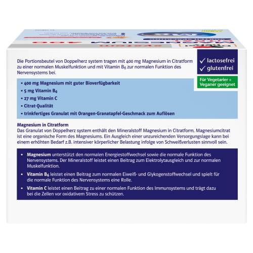 Die Portionsbeutel von Doppelherz system tragen mit 400 mg Magnesium in Citratform zu einer normalen Muskelfunktion und mit Vitamin B6 zur normalen Funktion des Nervensystems bei.