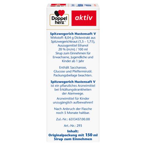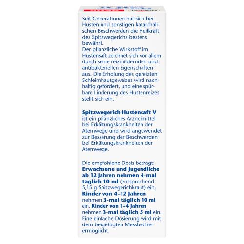 Spitzwegerich Hustensaft V, Sirup zum Einnehmen. Für Erwachsene und Kinder ab 1 Jahr. Wirkstoff: 8,04 g Dickextrakt aus Spitzwegerichkraut (1,5 – 1,7:1), Auszugsmittel Ethanol 20 % (m/m) / 100 ml.