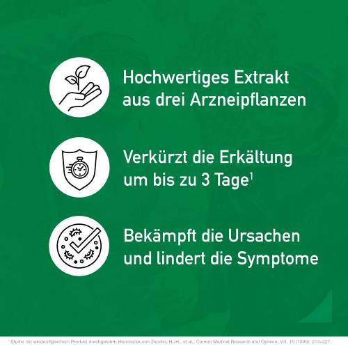 Die pflanzlich hochwirksame 5-fach konzentrierte Kombination, die die antiviralen, immunstimulierenden Eigenschaften der drei Arzneipflanzen vereint, greift die Erkältungserreger von 3 Seiten direkt an.