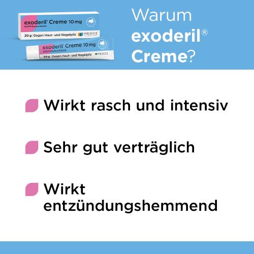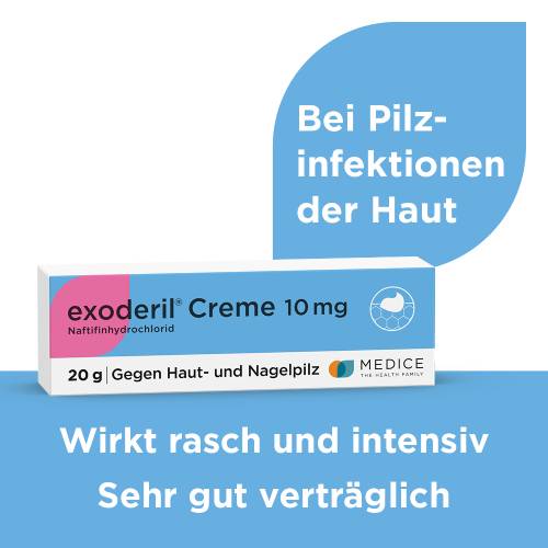 Exoderil besitzt mit Naftifin einen einzigartigen Wirksoff, der fungizid (pilzabtötend) gegenüber Dermatophyten und Schimmelpilzen wirkt und dennoch ausgezeichnet verträglich ist