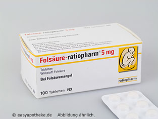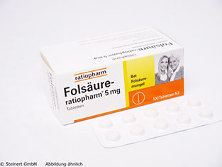 Die Folsäure Ratiopharm 5 mg Tabletten werden zum Ausgleich und zur Behandlung eines Folsäuremangels angewendet. Die Tabletten enthalten das B Vitamin Folsäure in einer Dosierung von 5 mg pro Tablette. ZU einem Mangel an Folsäure kann es durch eine unzureichende Zufuhr oder durch einen erhöhten Bedarf zum  Beispiel in der Schwangerschaft kommen. In der Schwangerschaft ist eine ausreichende Zufuhr an Folsäure besonders wichtig für eine gesunde Entwicklung des Kindes. Die Folsäure Ratiopharm 5 mg Tabletten gleicht einen Folsäuremangel aus und beugen den Mangelerscheinungen vor.