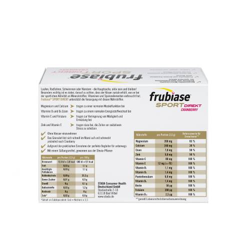 Aus viel Bewegung und Sport resultiert ein erhöhter Mikronährstoffbedarf. Beim Schwitzen gehen außerdem Salze und Mineralstoffe verloren. frubiase® SPORT DIREKT gibt dem Körper zurück, was er beim Sport verbraucht, und deckt den erhöhten Bedarf mit einer ausgewählten Kombination aus Mineralstoffen, Vitaminen und Spurenelementen. Es enthält für Sportler wichtiges Magnesium, Vitamin C, Vitamin E sowie u.a. wertvolle B-Vitamine.