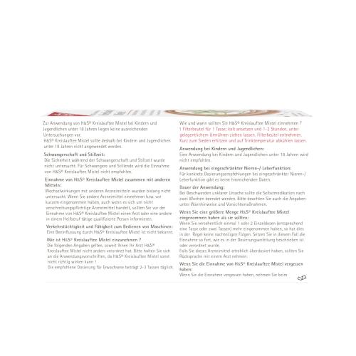 Erwachsene und Jugendliche ab 18 Jahren trinken 2-3 Tassen täglich. Wie und wann sollten Sie H&S® Kreislauftee Mistel einnehmen ? 1 Filterbeutel für 1 Tasse; kalt ansetzen und 1-2 Stunden, unter gelegentlichem Umrühren ziehen lassen. Filterbeutel entnehmen. Kurz zum Sieden erhitzen und auf Trinktemperatur abkühlen lassen. Bei Beschwerden unklarer Ursache sollte die Selbstmedikation nach zwei Wochen beendet werden. Bitte beachten Sie auch die Angaben unter „Vorsichtsmaßnahmen für die Anwendung“. Der Tee kann auch durch Ansetzen mit kaltem Wasser und mehrstündiges Ziehen bereitet werden. Danach den Auszug kurz aufkochen.