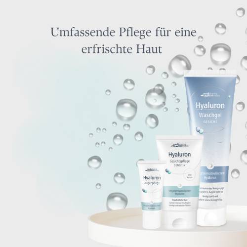 Um das Gesicht auf die Pflegecreme vorzubereiten eignet sich das Hyaluron Waschgel von medipharma cosmetics. Zur Pflege der Augenpartie kann ebenfalls morgens und abends die Hyaluron Augenpflege aufgetragen werden.