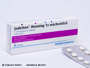 Die Jodetten Henning 1x wöchentlich Tabletten werden sowohl zum Ausgleich als auch zur Vorbeugung eines Jodmangels angewendet. Die Tabletten enthalten den wirksamen Inhaltsstoff Kaliumjodid. Das Jodid wird nach der Einnahme in der Schilddrüse gespeichert, wo es für den Aufbau von Schilddrüsenhormonen verwendet wird. Bei einem Jodmangel ist die Schilddrüse nicht in der Lage genügend Hormone zu produzieren, so dass es zu einer Schilddrüsenunterfunktion kommt. Die Jodetten Henning 1x wöchentlich Tabletten haben den Vorteil, dass sie nur einmal in der Woche genommen werden müssen.