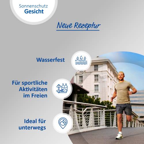 Tragen Sie die Sonnenschutz-Creme großzügig auf das Gesicht, die Hände und das Dekolleté auf. Den UV-Lippenschutz verwenden Sie wie einen normalen Lippenpflegestift. Cremen Sie nach Bedarf nach – vor allem nach dem Baden, Schwitzen oder Abtrocknen. Zu wenig Sonnenschutzmittel verringert den Lichtschutzfaktor.