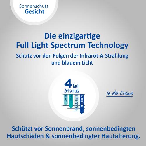 Sonnenstrahlen gibt es in verschiedenen Wellenlängen. Sie haben verschiedene Auswirkungen auf die Haut, wirken jedoch alle zellschädigend. Daher ist es wichtig einen Sonnenschutz zu verwenden, der rundum schützt. Dank einzigartigem 4-fach Zellschutz schützt die Ladival® Aktiv Sonnenschutz-Creme vor UV-A- und UV-B-Strahlen, vor den Folgen der Infrarot-A-Strahlung und sichtbarem Licht (einschließlich blauem Licht). So wird die Haut auch vor einer vorzeitigen, sonnenbedingten Hautalterung geschützt.