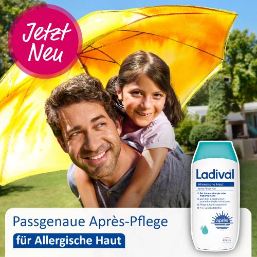 Nach dem Sonnenbaden ist es wichtig, die sonnengestresste Haut optimal zu pflegen und ihre Feuchtigkeitsspeicher aufzufüllen. Um Menschen mit allergischer Haut optimal zu versorgen, bietet Ladival® die Allergische Haut-Serie an. Diese wurde speziell für Haut entwickelt, die zu Sonnenallergie (polymorphe Lichtdermatose/PLD) und Mallorca-Akne neigt. Das Gel beruhigt die durch Sonneneinstrahlung beanspruchte Haut und pflegt sie intensiv.