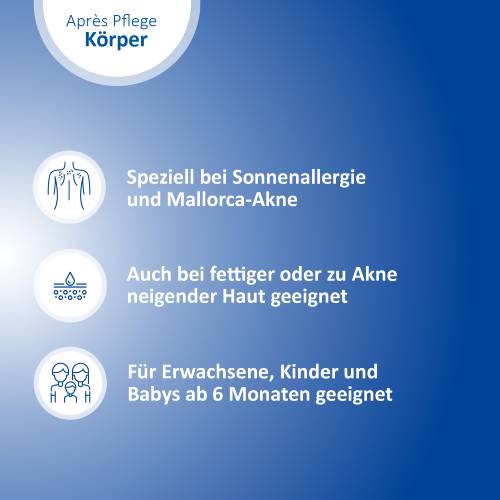 Dank seiner ultra-leichten, emulgatorfreien Rezeptur zieht das Après Pflege-Gel schnell ein und hinterlässt ein angenehmes Hautgefühl. Es pflegt, beruhigt und regeneriert die Haut mit Panthenol, Glycerin und Vitamin E, während es angenehm kühlt. Das Hydrodispersionsgel brennt nicht in den Augen und versorgt die Haut mit 24 Stunden Feuchtigkeit – für gepflegte und geschützte Haut. Die besonders milde Rezeptur eignet sich ebenfalls für Babys und Kinder ab 6 Monaten.