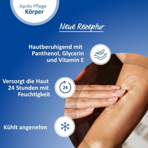 Das Après Pflege-Gel kühlt sofort angenehm nach dem Auftragen und spendet Ihrer Haut Feuchtigkeit.