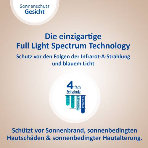 Sonnenstrahlen gibt es in verschiedenen Wellenlängen. Sie haben verschiedene Auswirkungen auf die Haut, wirken jedoch alle zellschädigend. Daher ist es wichtig einen Sonnenschutz zu verwenden, der rundum schützt. Dank einzigartigem 4-fach Zellschutz schützt die Ladival® Anti-Pigmentflecken Sonnenschutz-Creme vor UV-A- und UV-B-Strahlen, vor den Folgen der Infrarot-A-Strahlung und sichtbarem Licht (einschließlich blauem Licht). So wird die Haut auch vor einer vorzeitigen, sonnenbedingten Hautalterung geschützt.
