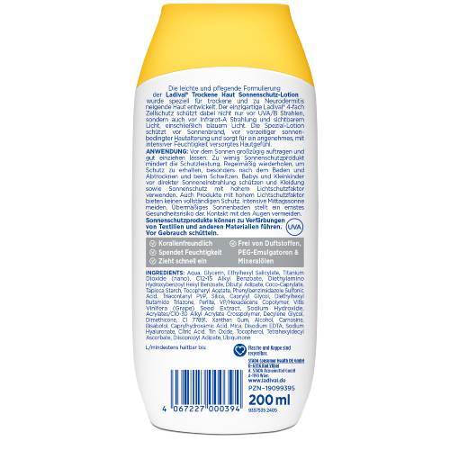 Sonnenstrahlen gibt es in verschiedenen Wellenlängen. Sie haben verschiedene Auswirkungen auf die Haut, wirken jedoch alle zellschädigend. Daher ist es wichtig einen Sonnenschutz zu verwenden, der rundum schützt. Dank einzigartigem 4-fach Zellschutz schützt die Ladival® Trockene Haut Sonnenschutz-Lotion vor UV-A- und UV-B-Strahlen, vor den Folgen der Infrarot-A-Strahlung und sichtbarem Licht (einschließlich blauem Licht). So wird die Haut auch vor einer vorzeitigen, sonnenbedingten Hautalterung geschützt.