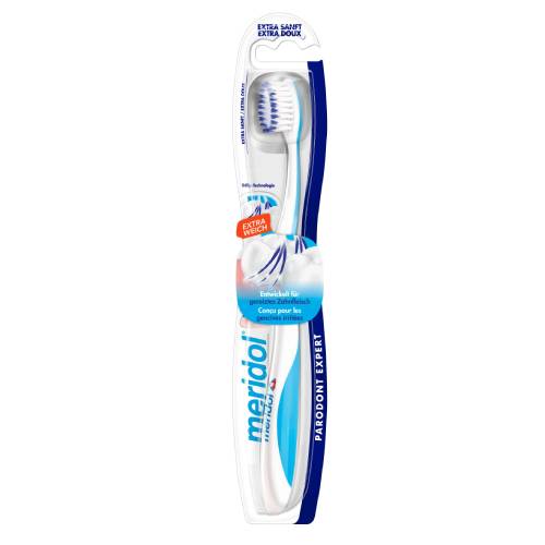 Die meridol Parodont Expert Zahnbürste kombiniert mikrofeine Borstenenden mit TriTip-Borsten und sorgt somit für eine tiefere* Reinigung am Zahnfleischrand und für eine effektivere Plaque-Entfernung mit weniger Druck.