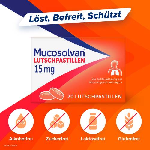 Mucosolvan® Lutschpastillen 15 mg. Wirkstoff: Ambroxolhydrochlorid. Anwendungsgebiet: Zur Schleim lösenden Behandlung bei akuten und chronischen Erkrankungen der Bronchien und der Lunge mit zähem Schleim. Warnhinweis: Enthält Sorbitol, Maltitol, Pfefferminzöl und Eukalyptusöl. Apothekenpflichtig.