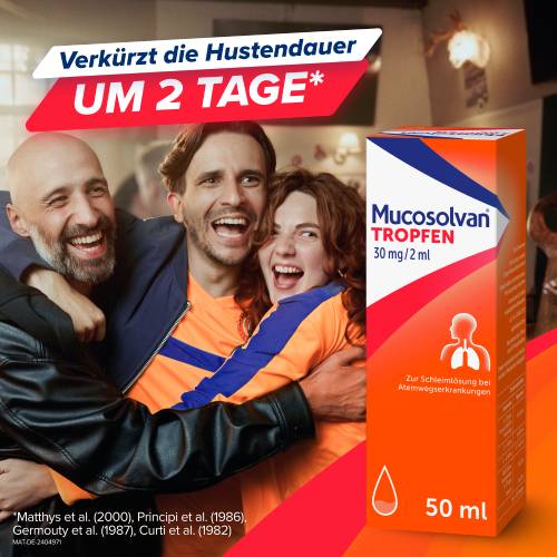 Bei starkem Husten unterstützen. MUCOSOLVAN® Tropfen das Abhusten des festsitzenden Schleims durch den verwendeten Wirkstoff Ambroxol. Dieser unterstützt die natürliche Selbstreinigung der Atemwege , löst das Sekret und schützt vor neuer Schleimbildung. So helfen MUCOSOLVAN® Tropfen, den Erkältungshusten nach und nach abklingen zu lassen.