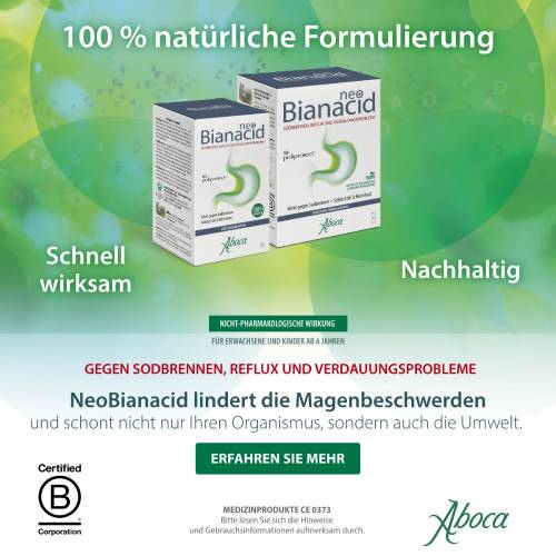 Produktbeschreibung: NeoBianacid Übersäuerung und Reflux ist ein Produkt auf Basis pflanzlicher und mineralischer Molekülkomplexe, das schützend und deshalb schmerzlindernd auf die Schleimhaut des Magens und der Speiseröhre wirkt und somit den typischen Symptomen gereizter und entzündeter Schleimhaut wie Sodbrennen, Schmerzen und Säuregefühl rasch entgegenwirkt. NeoBianacid Übersäuerung und Reflux kann prophylaktisch in Situationen eingesetzt werden, die Schleimhautreizungen verursachen können (Einnahme nichtsteroidaler entzündungshemmender Arzneimittel/Schmerzmittel, bei psychisch-körperlichem Stress, Jahreszeitenwechsel, ungesunder Ernährung und Lebensweise).