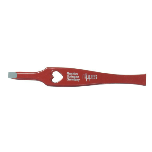 Rote abgewinkelte Pinzette mit Herzstanzung, rostfrei. Von Nippes aus Solingen, Hersteller hochwertiger Pediküre-, Maniküre- und Beauty-Produkte.