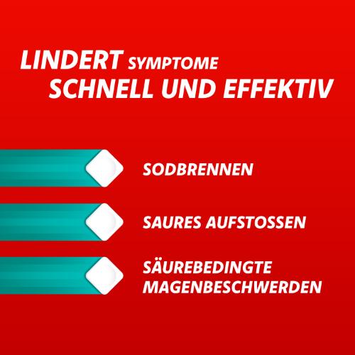 • schnelle Hilfe bei säurebedingten Magenbeschwerden wie Sodbrennen, saurem Aufstoßen, Völlegefühl und Magendruck