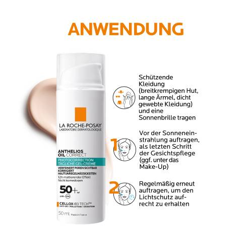 Die mattierende Gel-Creme Anthelios Oil Correct LSF 50+ von La Roche Posay nach der Reinigung auf das Gesicht auftragen. Anschließend mit sanft kreisenden Bewegungen in die Haut einmassieren – dabei die Augenpartie aussparen. Die Tagescreme mit Lichtschutz zieht schnell in die Haut ein und eignet sich auch bei empfindlicher sowie zu Sonnenallergie neigender Haut. Als perfekte Pflege-Routine empfiehlt sich zwischen der Reinigung und dem Anthelios Oil Correct LSF 50+ noch das ergänzende Serum aufzutragen. Das La Roche Posay EFFACLAR Hochkonzentriertes Serum für fettige und zu Akne neigende Haut wirkt dank seiner peelenden Wirkung Unreinheiten und Pickelmalen entgegen und verfeinert die Poren.