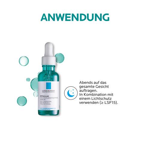 Das La Roche Posay EFFACLAR Hochkonzentriertes Serum als Bestandteil der täglichen Hautpflege-Routine am Abend nach der Reinigung anwenden. Das Serum für unreine Haut auf das gereinigte Gesicht auftragen und sanft verteilen. Dabei die Augenpartie aussparen und nicht auf offene Wunden oder Narben auftragen. Bei Kontakt mit den Augen diese umgehend gründlich mit klarem Wasser ausspülen. Das EFFACLAR Serum in Verbindung mit einem täglichen Sonnenschutzmittel (LSF >15), wie beispielsweise dem ANTHELIOS Invisible Fluid UVMune 400 LSF 50+, anwenden. Besonders gut lässt sich das Gesichtsserum mit dem EFFACLAR Mikro-Peeling Reinigungsgel kombinieren.