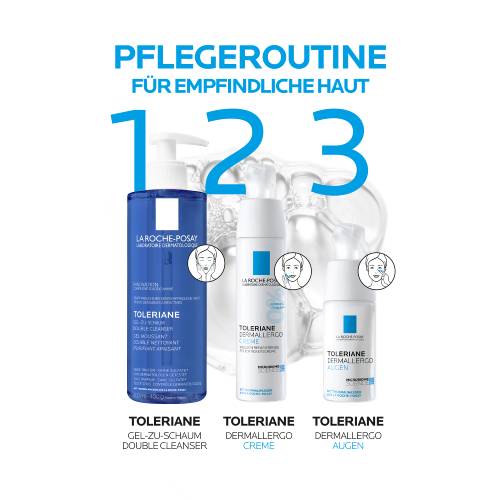 Anwendungshinweis: Für die tägliche Gesichtsreinigung den TOLERIANE Gel-zu-Schaum Double Cleanser morgens und abends auf die nasse Haut im Gesicht und rund um die Augenpartie auftragen. Den Gesichtsreiniger sanft einmassieren und anschließend gründlich abspülen. Nachfolgend empfiehlt sich die Anwendung einer Gesichtspflege – wie z. B. die TOLERIANE Dermallergo Gesichtscreme.