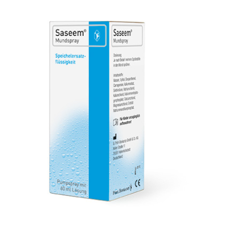 Saseem Mundspray Pumplösung ist eine Speichelersatzflüssigkeit zur intensiven Befeuchtung der Mundschleimhaut bei Mundtrockenheit und Störungen der Speichelproduktion. Der Mund- und Rachenraum wird mit einem schützenden und pflegenden Feuchtigkeitsfilm bedeckt.
