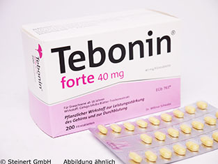 Die Tebonin forte 40 mg Filmtabletten werden zur Behandlung von Beschwerden bei durch altersbedingte Arterienverengung hirnorganisch bedingten Leistungsstörungen mit den Hauptbeschwerden Rückgang der Gedächtnisleistung, Merkfähigkeit und Konzentration, Kopfschmerzen, Schwindelgefühle, Ohrensausen angewendet. Der in den Filmtabletten enthaltene Ginkgo-Spezialextrakt verbessert die Fließeigenschaften des Blutes, besonders im Bereich kleiner und kleinster Blutgefäße. Die Tebonin forte 40 mg Filmtabletten führen zu einer besseren Versorgung des Gewebes mit Blut und Sauerstoff sowie wichtigen Energiestoffen und schützt die Gewebszellen vor den schädigenden Einflüssen des Sauerstoffmangels.